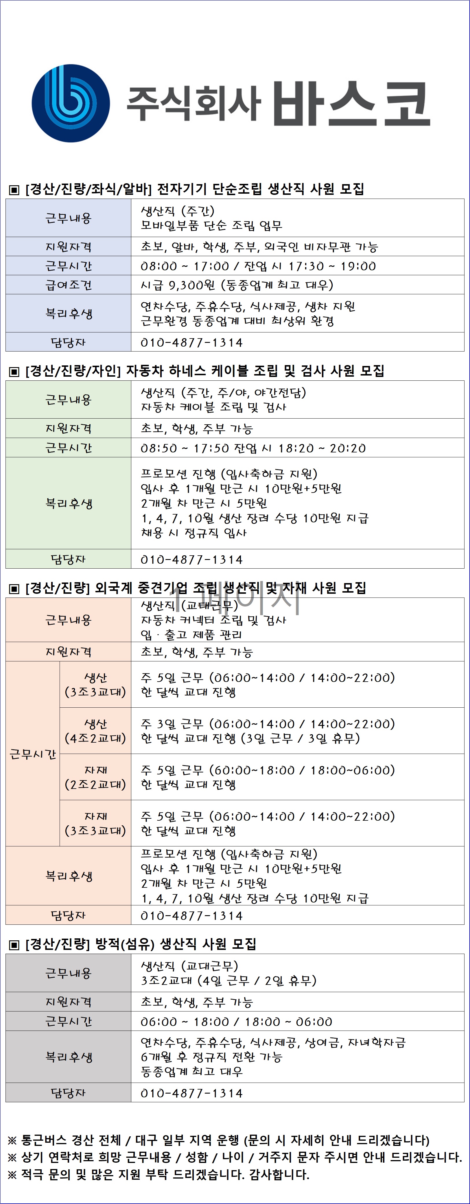 [경산/진량/자인] 생산직 사원 모집 / 단순 업무 / 초보